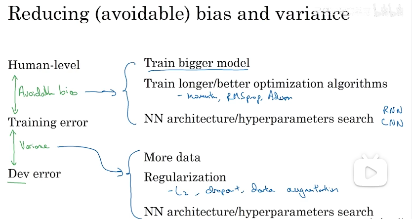 根据贝叶斯误差、训练误差、验证误差来指定策略(解决高方差或者高偏差)