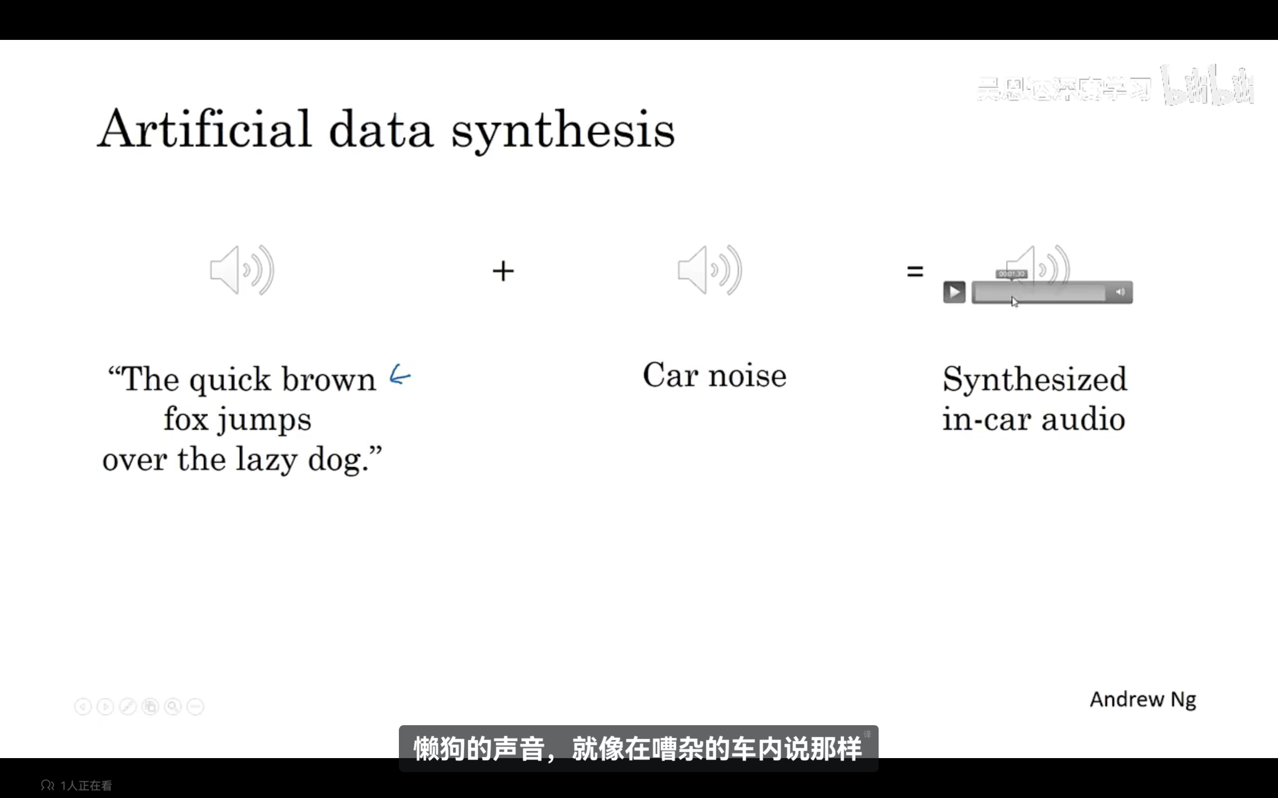 如何解决第9点说到的数据不匹配问题。我们可以对开发集进行错误分析,了解到开发集和训练集具体的不同之处,尝试是训练集与开发集更加相似。或者尝试收集更多类似于开发测试集的数据。比如说,如果模型在开发集中很难识别清楚数字,那么我们可以在训练集中多加入一些有关数字的数据。还有其他的方法吗?我们可以使用人工数据合成,示例如下: