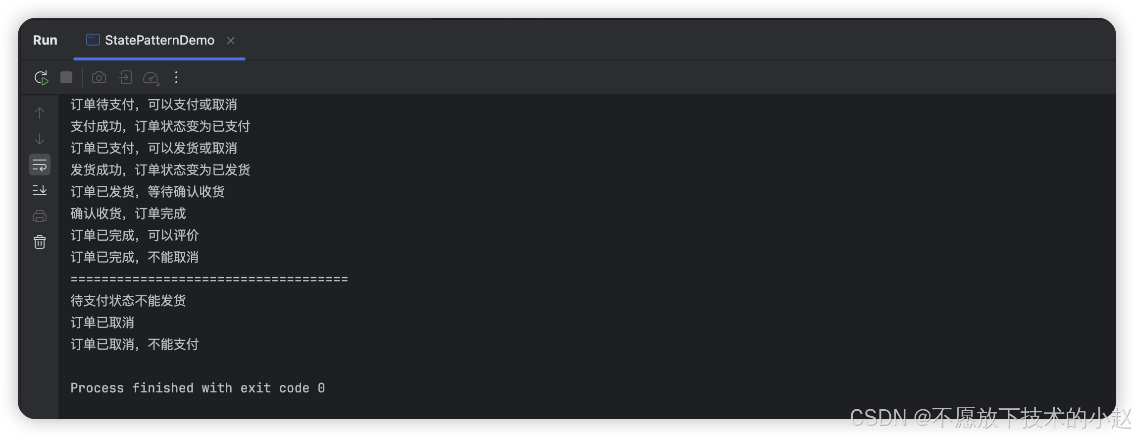 public class StatePatternDemo {public static void main(String[] args) {OrderContext order = new OrderContext("ORDER001");// 初始状态order.handle();order.pay();// 已支付状态order.handle();order.ship();// 已发货状态order.handle();order.confirm();// 已完成状态order.handle();order.cancel();System.out.println("====================================");// 测试异常流程OrderContext order2 = new OrderContext("ORDER002");order2.ship(); // 待支付状态尝试发货order2.cancel(); // 取消订单order2.pay(); // 已取消状态尝试支付}