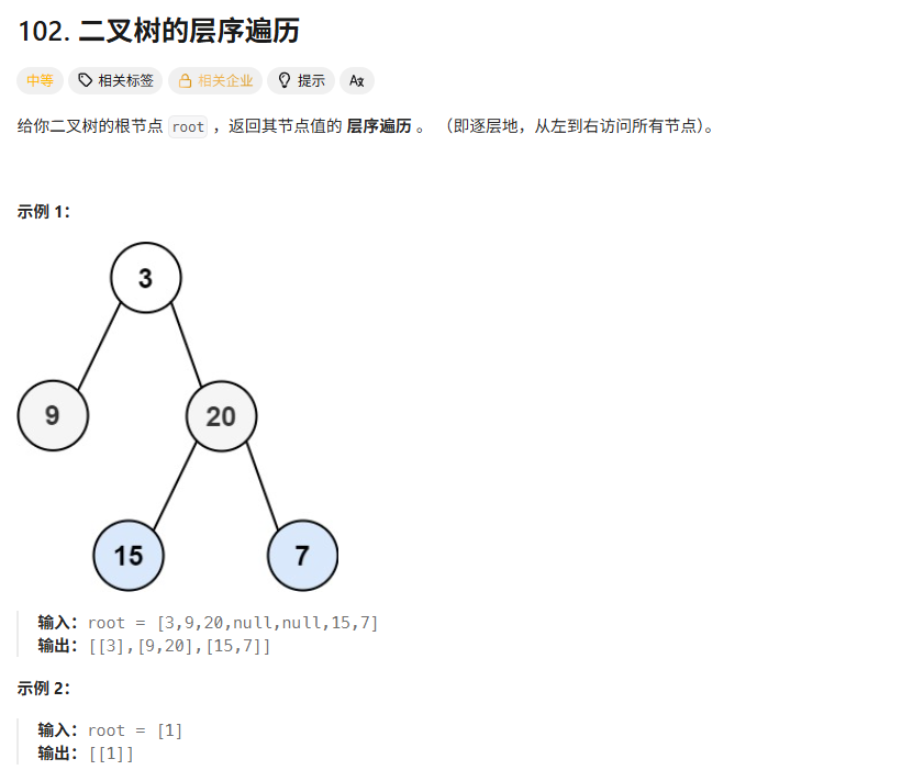 class Solution {public List<List<Integer>> levelOrder(TreeNode root) {List<TreeNode>list=new ArrayList();List<TreeNode>list1=new ArrayList();List<List<Integer>>result=new ArrayList();if(root==null)return result;List<Integer>r=new ArrayList();list.add(root);int flag=1;while(list.size()!=0||list1.size()!=0){if(flag==1&&list.size()!=0){ TreeNode tmp=list.get(0);if(tmp.left!=null){list1.add(tmp.left);}if(tmp.right!=null){list1.add(tmp.right);}r.add(tmp.val);list.remove(0);if(list.size()==0){flag=0;result.add(r);r=new ArrayList();}}if(flag==0&&list1.size()!=0){TreeNode tmp=list1.get(0);if(tmp.left!=null){list.add(tmp.left);}if(tmp.right!=null){list.add(tmp.right);}r.add(tmp.val);list1.remove(0);if(list1.size()==0){flag=1;result.add(r);r=new ArrayList();} }}return result;}