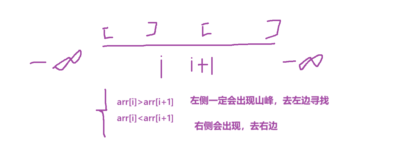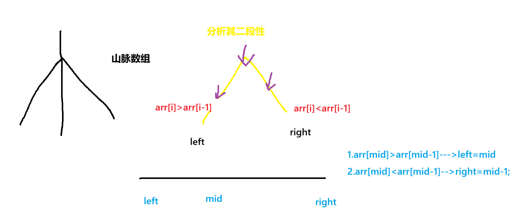 我们可以利用这一特性将数组一份为二,如果中间的数大于mid-1,那么那么他处于山脉的左侧,我们需要让left=mid,继续进行二分,如果小于mid-1,那么他处于山脉的右侧,并且这个mid一定不是峰顶,所以right=mid-1;