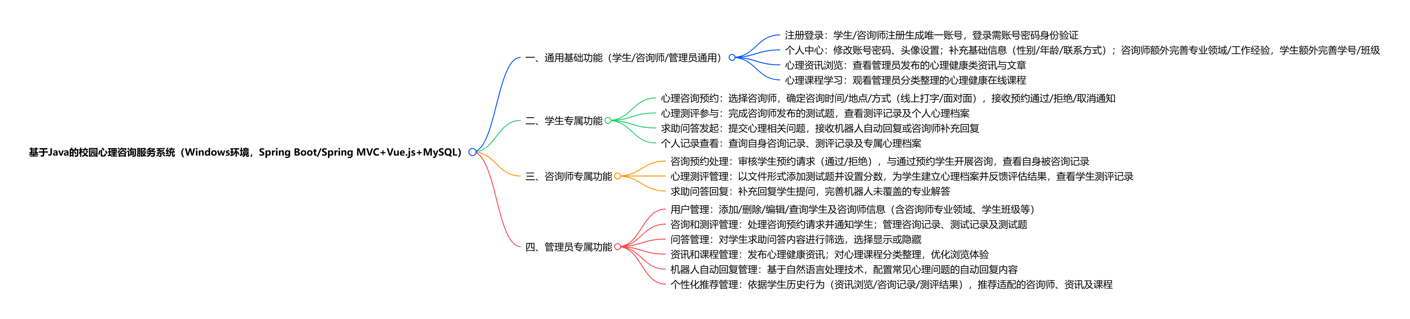 - 通用基础功能:三类角色均支持注册登录(学生、咨询师注册生成唯一账号,登录需身份验证)与个人中心操作(修改账号密码、头像、联系方式等个人信息,咨询师可补充专业领域、工作经验,学生可完善学号、班级);学生与咨询师可共同使用心理资讯浏览(查看管理员发布的心理健康资讯)、心理课程学习(观看管理员整理的在线心理课程)功能。