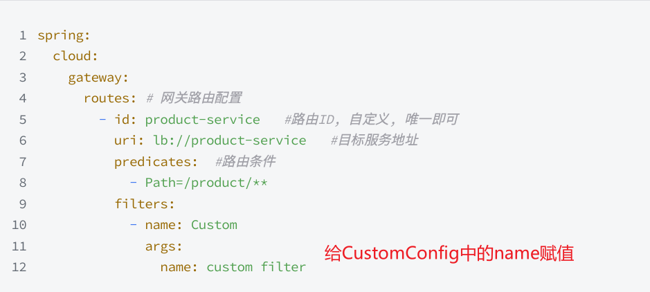 CustomConfig 中有一个 name 属性,name 的值可以从 yaml 配置文件中获取并传递到过滤器中。