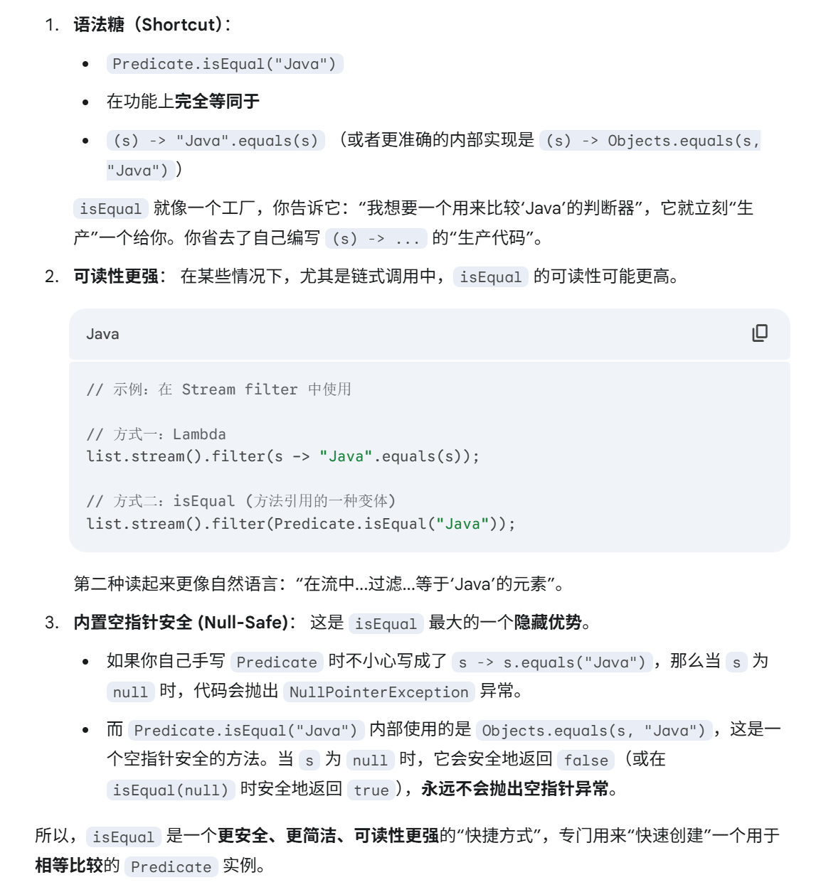 这是一个静态工厂方法,返回一个 Predicate。这个 Predicate 的作用是判断传入的参数是否等于 targetRef。让我们不必自己动手写 Lambda 表达式,而是直接调用一个方法来得到一个“现成的” Predicate 实例。