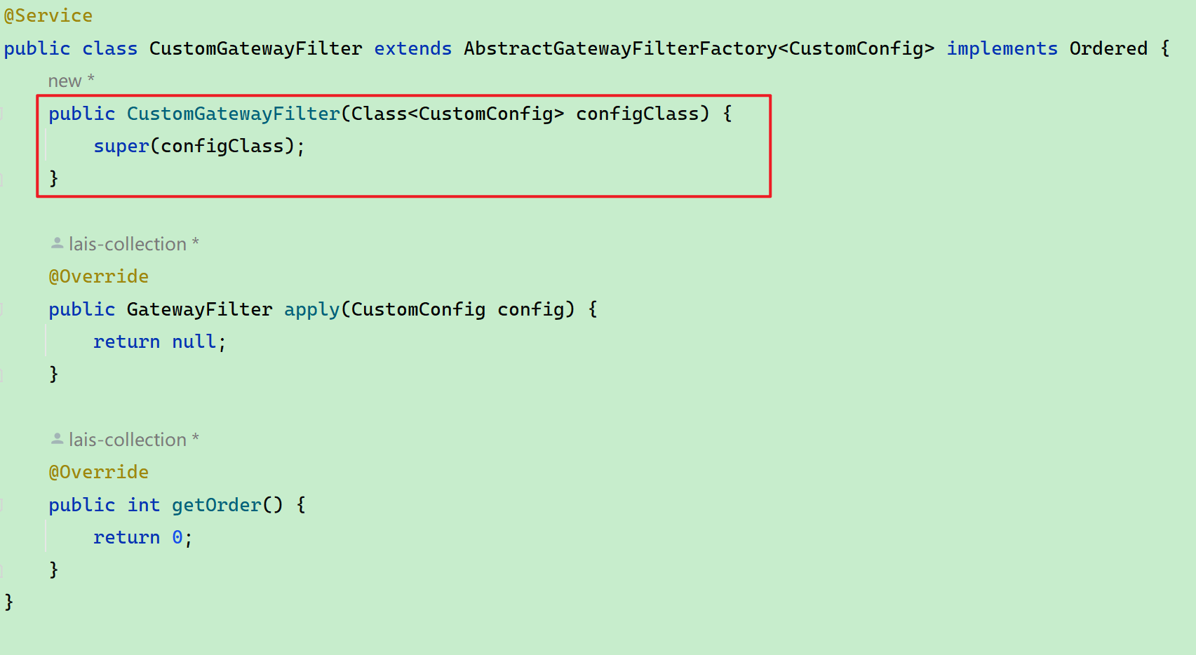 此外,还需要补充一个 CustomGatewayFilterFactory 的构造方法