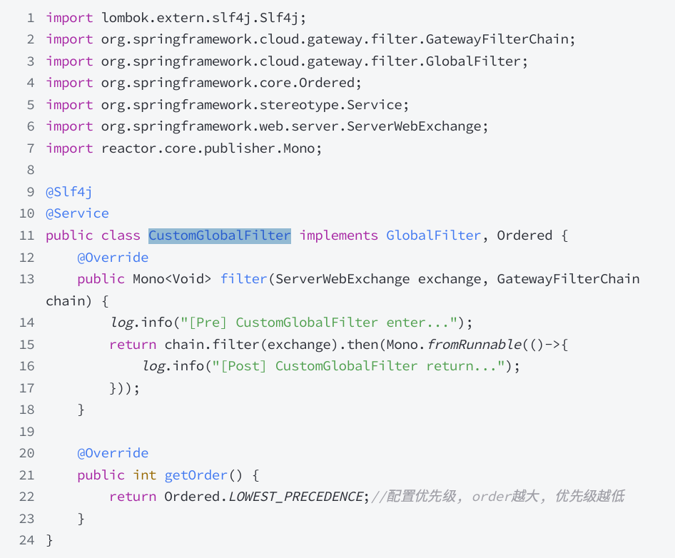 GlobalFilter 实现比较简单,不需要额外的配置,只需要实现 GlobalFiler 接口,自动会过滤所有的 Filter