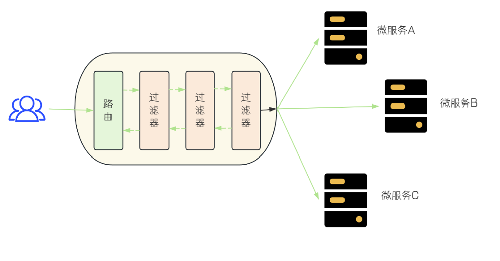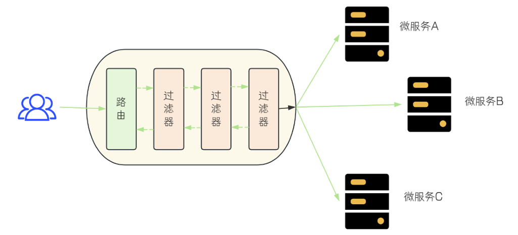 2. 动态路由:一切请求先经过网关,但网关不对业务进行处理,而是根据某种规则,把请求转发到某个微服务。