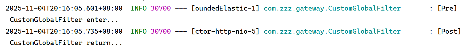 前面的 Predicate 决定了请求由哪一个路由进行处理,如果在请求处理前后需要增加一些逻辑,这就是 Filter(过滤器)的作用范围。