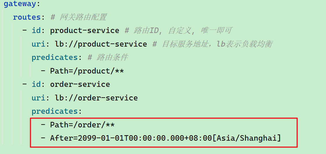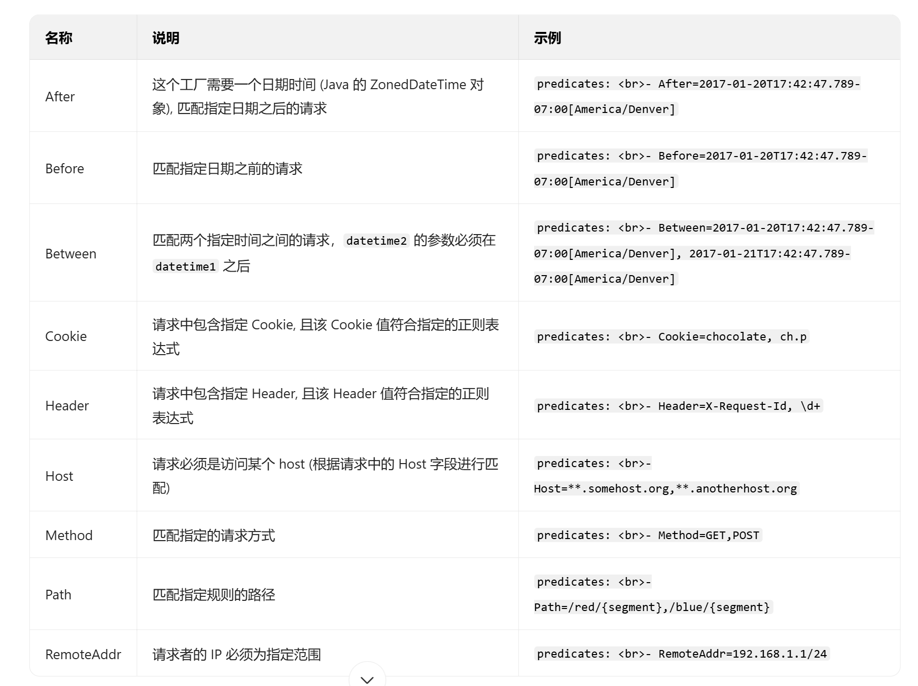 3. predicates(断言):定义路由匹配条件,当请求满足所有断言条件时,路由才会到对应的 uri
