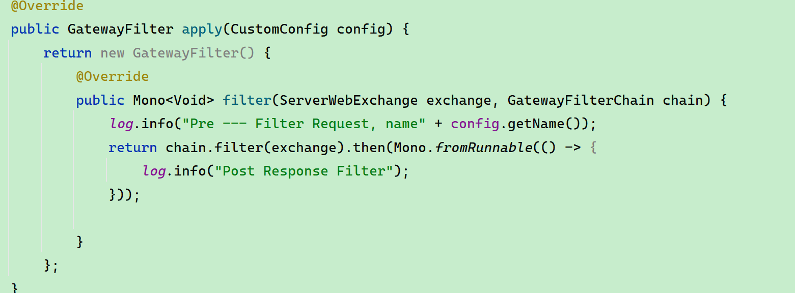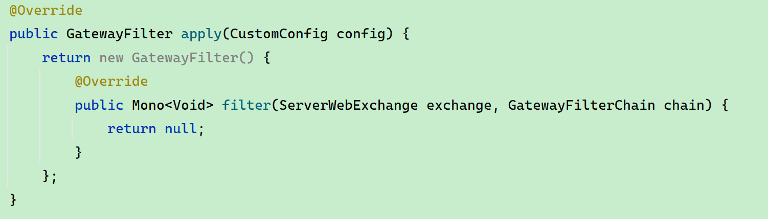 然后实现 apply 方法,返回值为 GatewayFilter,new 一个 GatewayFilter 匿名内部类