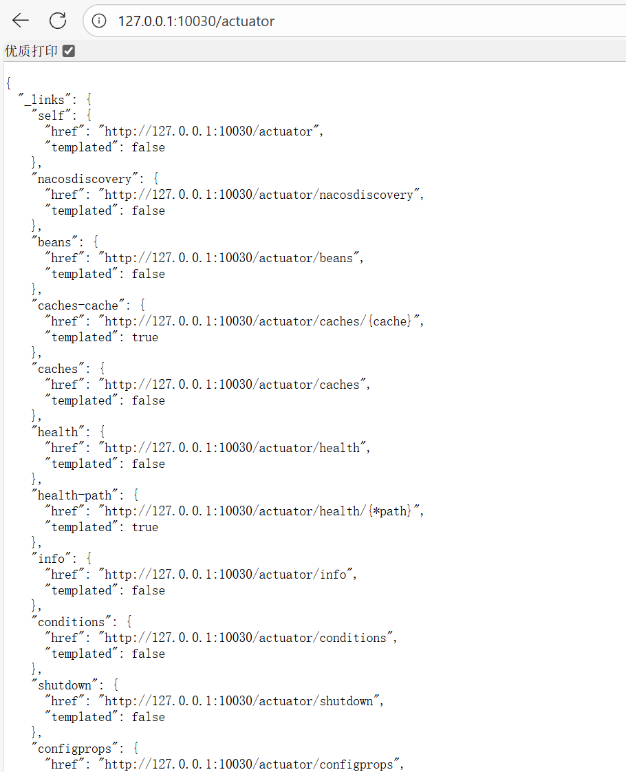 访问:127.0.0.1:10030/actuator 显示所有监控的信息链接
