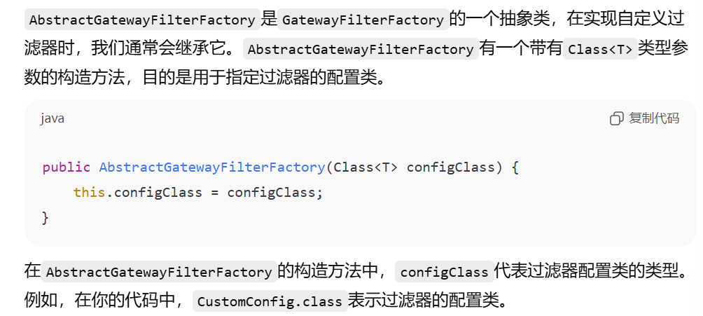 在这个构造方法中,调用父类 AbstractGatewayFilterFactory 的构造方法,并传入了 CustomConfig.class 作为参数。