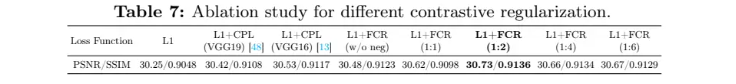 显著提升性能: 实验证明(见表7和表8),在现有损失函数基础上增加FCR,能够为不同模型和任务带来普遍且显著的性能提升(如在Rain200H上提升0.48 dB PSNR),且几乎不增加训练开销。