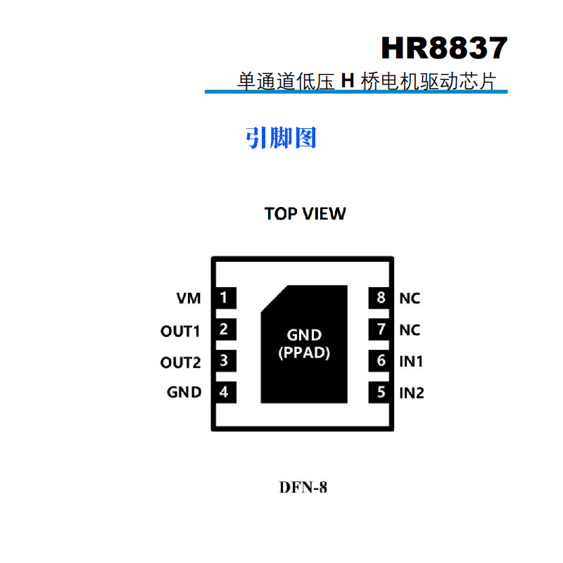 在封装和环保设计上,HR8837也充分考虑了实际应用场景。它采用带有裸露焊盘的DFN-8封装,尺寸仅为2mm*2mm,这种小巧的体积特别适合那些追求小型化的设备,比如相机的调焦模块,本来内部空间就紧张,小尺寸芯片能大大节省布局空间。同时,HR8837是严格的无铅产品,完全符合全球通用的环保要求,不管是生产企业还是终端用户,都不用担心环保合规问题。