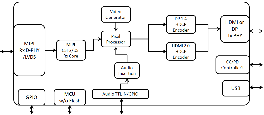 - RISC-V 微控制器:内置增强型 RISC-V 处理器,支持本地控制和自定义固件开发,可实现色彩空间转换(4:2:0 ↔ 4:4:4/4:2:2)、去隔行、动态分辨率切换等功能,无需外部 MCU。