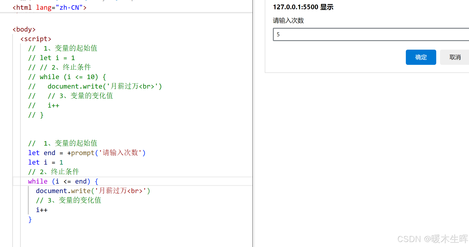 // 1、变量的起始值let i = 1// 2、终止条件while (i <= 3) {document.write('我要循环三次<br>')// 3、变量的变化值i++}4、案例