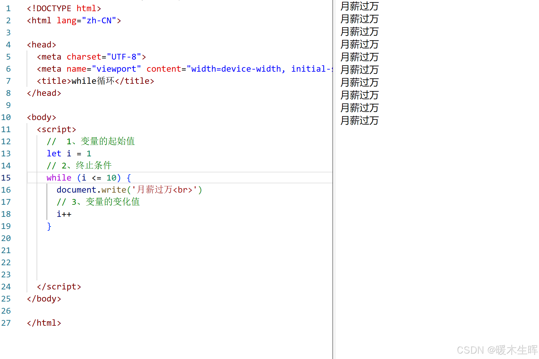 (1)需求:使用while循环,在页面中打印输出10句“月薪过万”,可以添加换行效果