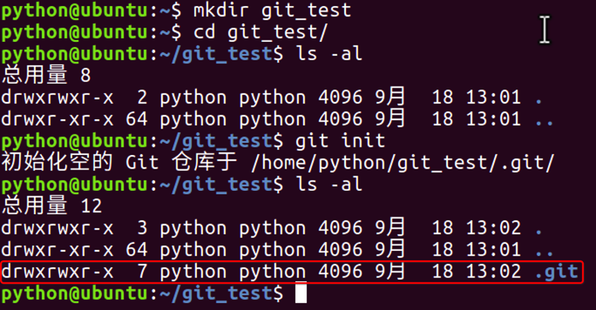 可以看到在git_test目录下创建了一个.git隐藏目录,这就是版本库目录。