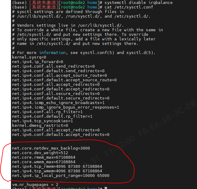修改/etc/sysctl.conf,增加下图圈出来的内容,配置maxbacklog和网卡接收缓冲区
