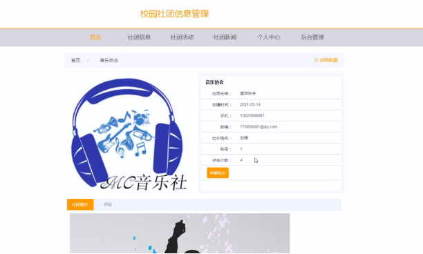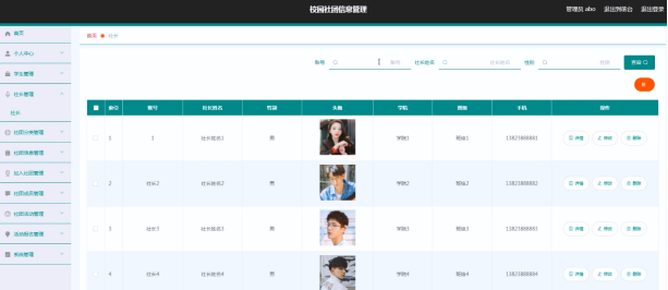 本校园社团信息管理系统管理员功能有个人中心,学生管理,社长管理,社团分类管理,社团信息管理,加入社团管理,社团成员管理,社团活动管理,活动报名管理,系统管理等。社长添加社团,管理员审核社团,学生加入社团,社长审核社团。因而具有一定的实用性。