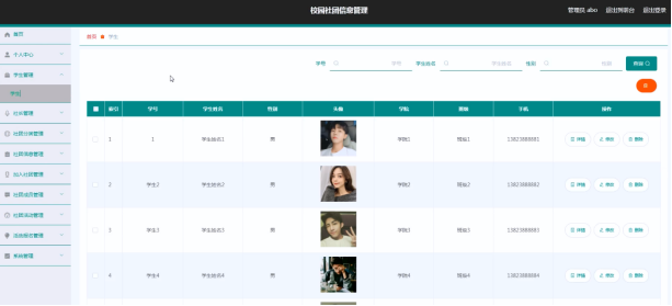 校园社团信息管理系统的系统管理员可以管理学生,可以对学生信息修改删除以及查询操作。具体界面的展示如图所示。