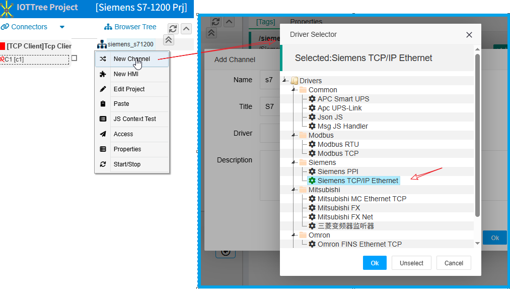 接着,我们在中间浏览树根节点,鼠标右键选择“New Channel”。在弹出的窗口填写如下内容,其中驱动点击选择"Siemens TCP/IP Ethernet"。