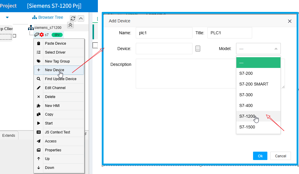 然后鼠标右键此通道"s7",选择"New Device"新增PLC对应的设备,弹出对话框中填写如下: