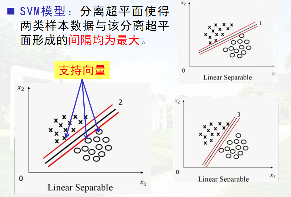 构造 SVM 模型的关键在于找到一个使得两类不同类型样本之间间隔最大的超平面,通常采用间隔最大的优化计算方式构造 SVM 。