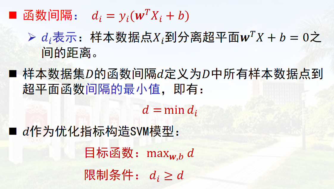 d反映了超平面对整个数据集的 “分类裕度”,d 越大,超平面离所有样本的 “安全距离” 越远,分类鲁棒性越强。
