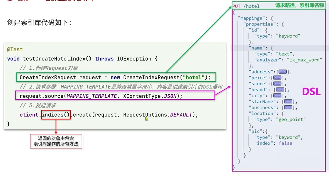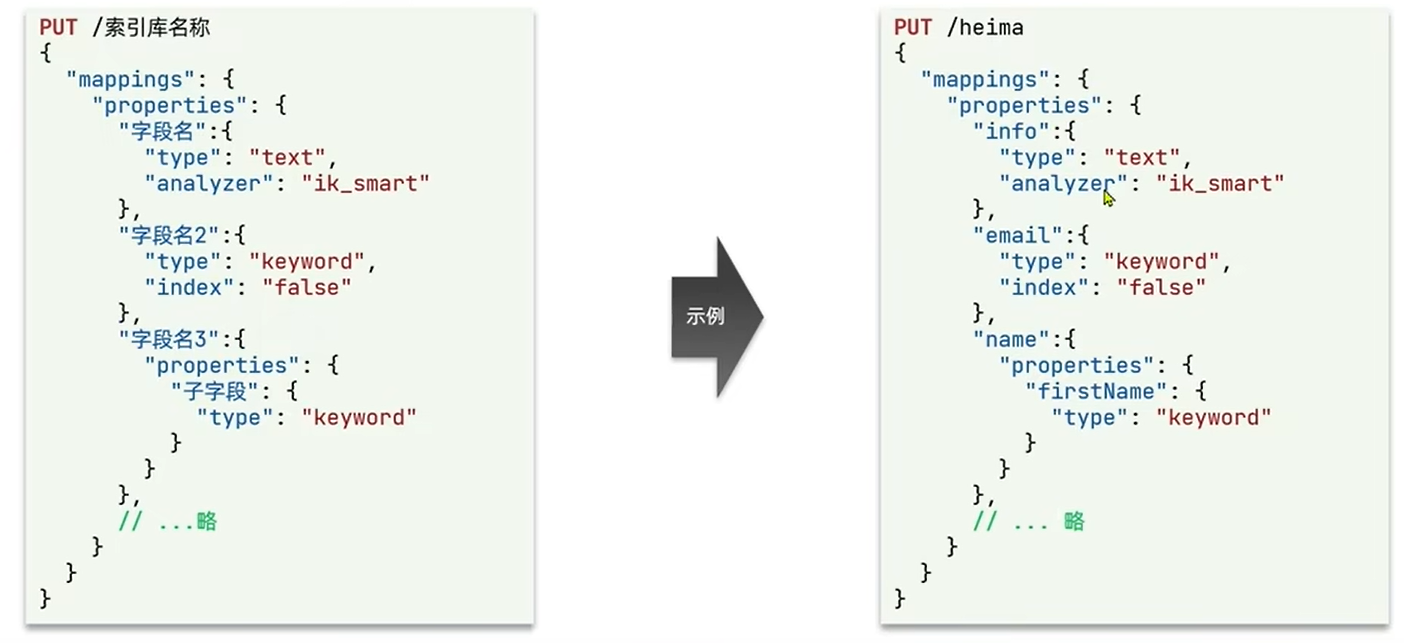 ES中通过Resful请求操作索引库、文档。请求内容是DSL语句来表示。创建索引库和mapping的DSL语法如下: