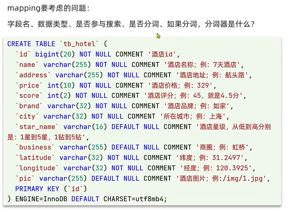 CREATE TABLE `tb_hotel` (`id` bigint(20) NOT NULL COMMENT '酒店id',`name` varchar(255) CHARACTER SET utf8mb4 COLLATE utf8mb4_general_ci NOT NULL COMMENT '酒店名称',`address` varchar(255) CHARACTER SET utf8mb4 COLLATE utf8mb4_general_ci NOT NULL COMMENT '酒店地址',`price` int(10) NOT NULL COMMENT '酒店价格',`score` int(2) NOT NULL COMMENT '酒店评分',`brand` varchar(32) CHARACTER SET utf8mb4 COLLATE utf8mb4_general_ci NOT NULL COMMENT '酒店品牌',`city` varchar(32) CHARACTER SET utf8mb4 COLLATE utf8mb4_general_ci NOT NULL COMMENT '所在城市',`star_name` varchar(16) CHARACTER SET utf8mb4 COLLATE utf8mb4_general_ci NULL DEFAULT NULL COMMENT '酒店星级,1星到5星,1钻到5钻',`business` varchar(255) CHARACTER SET utf8mb4 COLLATE utf8mb4_general_ci NULL DEFAULT NULL COMMENT '商圈',`latitude` varchar(32) CHARACTER SET utf8mb4 COLLATE utf8mb4_general_ci NOT NULL COMMENT '纬度',`longitude` varchar(32) CHARACTER SET utf8mb4 COLLATE utf8mb4_general_ci NOT NULL COMMENT '经度',`pic` varchar(255) CHARACTER SET utf8mb4 COLLATE utf8mb4_general_ci NULL DEFAULT NULL COMMENT '酒店图片',PRIMARY KEY (`id`) USING BTREE