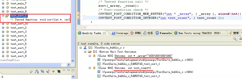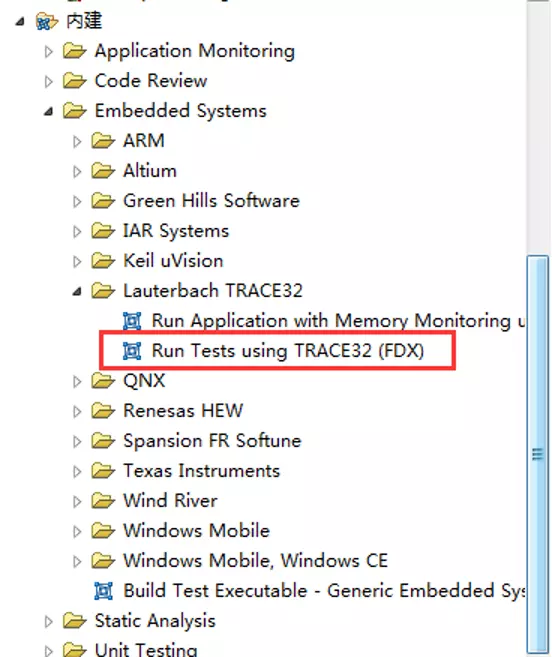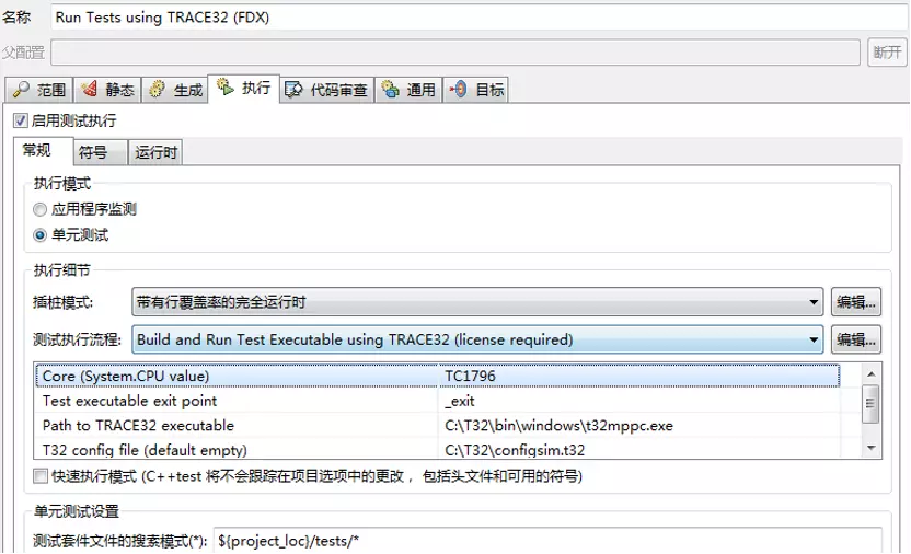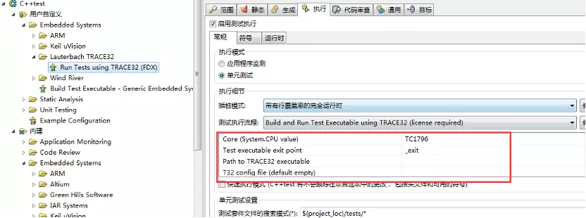 通过这两个参数设置C++test执行单元测试的测试配置。这里选择内建的针对劳特巴赫trace32的测试配置。
