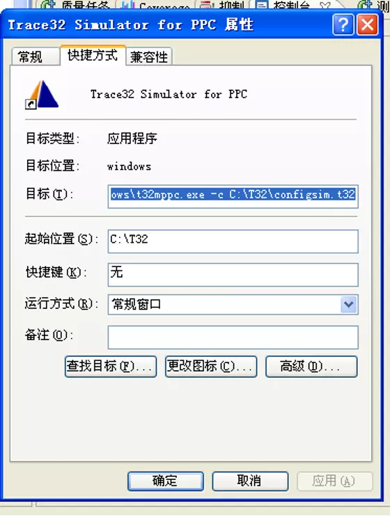 在此属性对话框中有两个参数,一个是启动的trace32的程序名,另外一个是配置文件名。