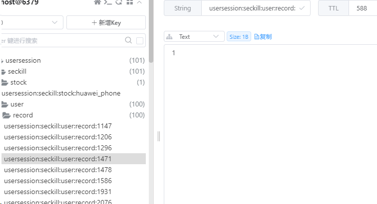 {userId = _threadLocalRandom.Value.Next(1000, 10000);// 1.检查用户是否已下单(无锁)string userRecordKey = $"seckill:user:record:{userId}";if (UserRedisHelper.Exists(userRecordKey)){return BadRequest("您已参与过该商品秒杀,不可重复下单");}// 2. 检查库存(无锁,并发时会超卖)string stockKey = "seckill:stock:huawei_phone";int currentStock = UserRedisHelper.Get<int>(stockKey);if (currentStock <= 0){return BadRequest("手慢了,商品已抢完");}Thread.Sleep(1);// 3. 扣减库存(无锁,多实例并发时会超卖)UserRedisHelper.Set(stockKey, currentStock - 1);// 4. 记录用户下单(无锁,可能重复记录)UserRedisHelper.Set(userRecordKey, 1, 600); // 10分钟过期return Ok("秒杀成功!");