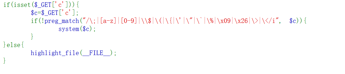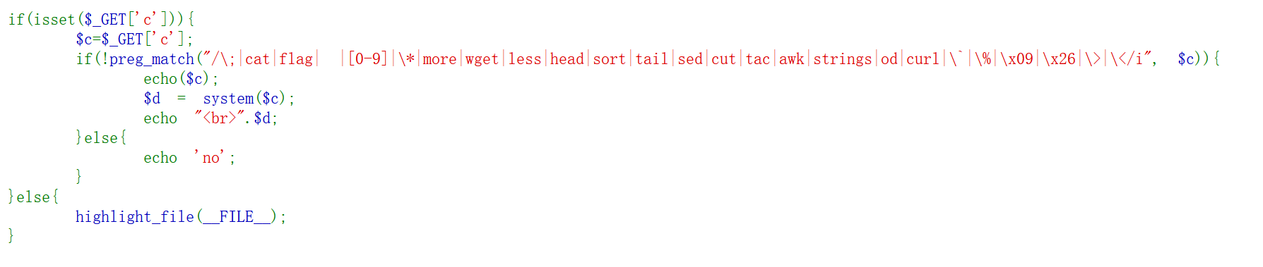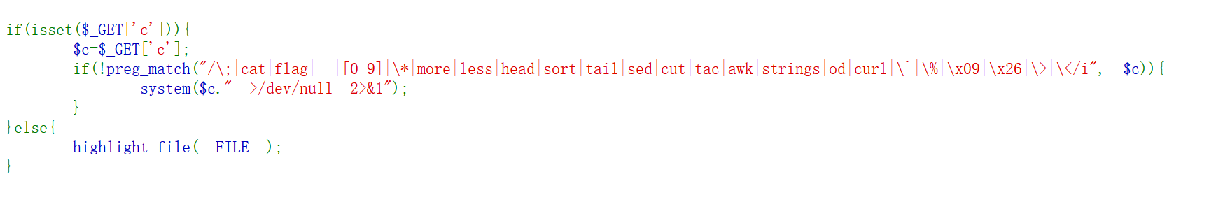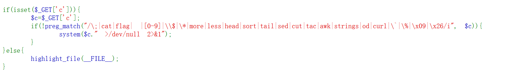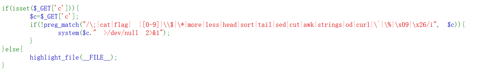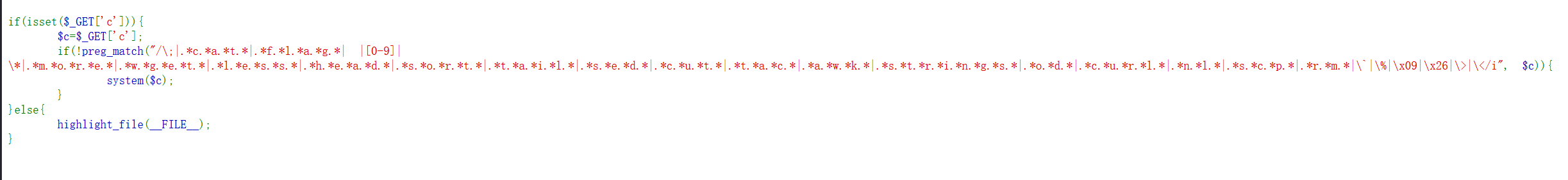 这里的规则为解释,*c.*a.*t.*指过滤包含字母c、a、t按顺序出现的任何字符串。也就是说不能使用\等方式绕过。但是?和$还是可以用的,就是需要绕过如何查看文件内容的命令。