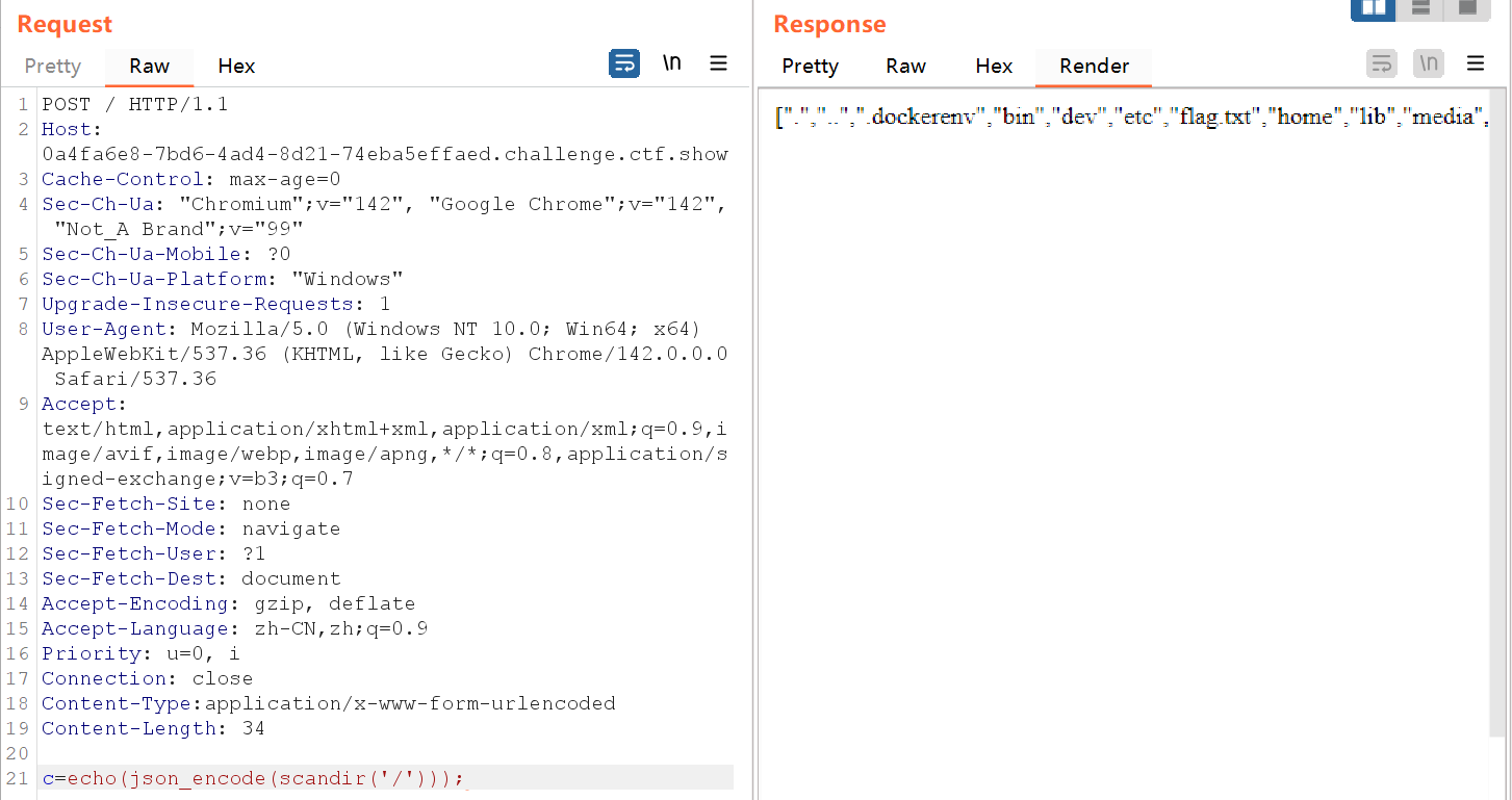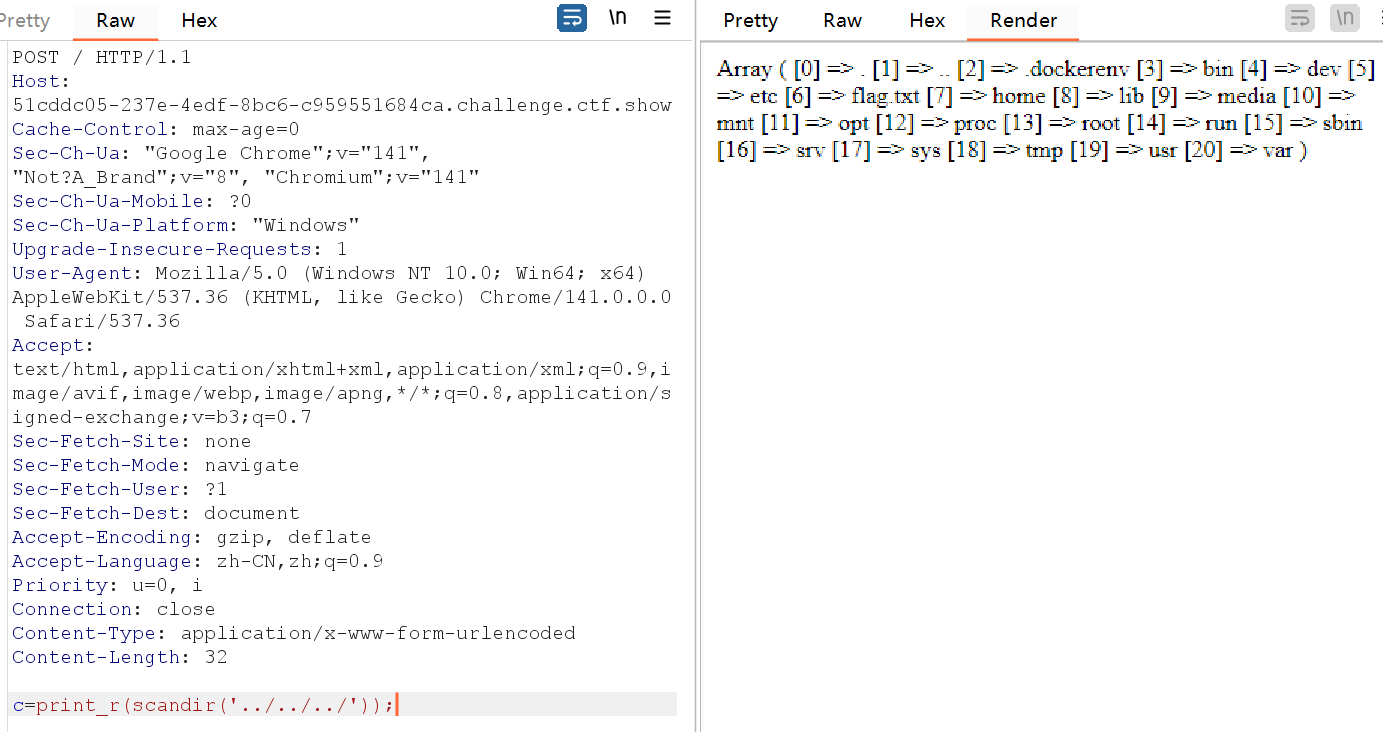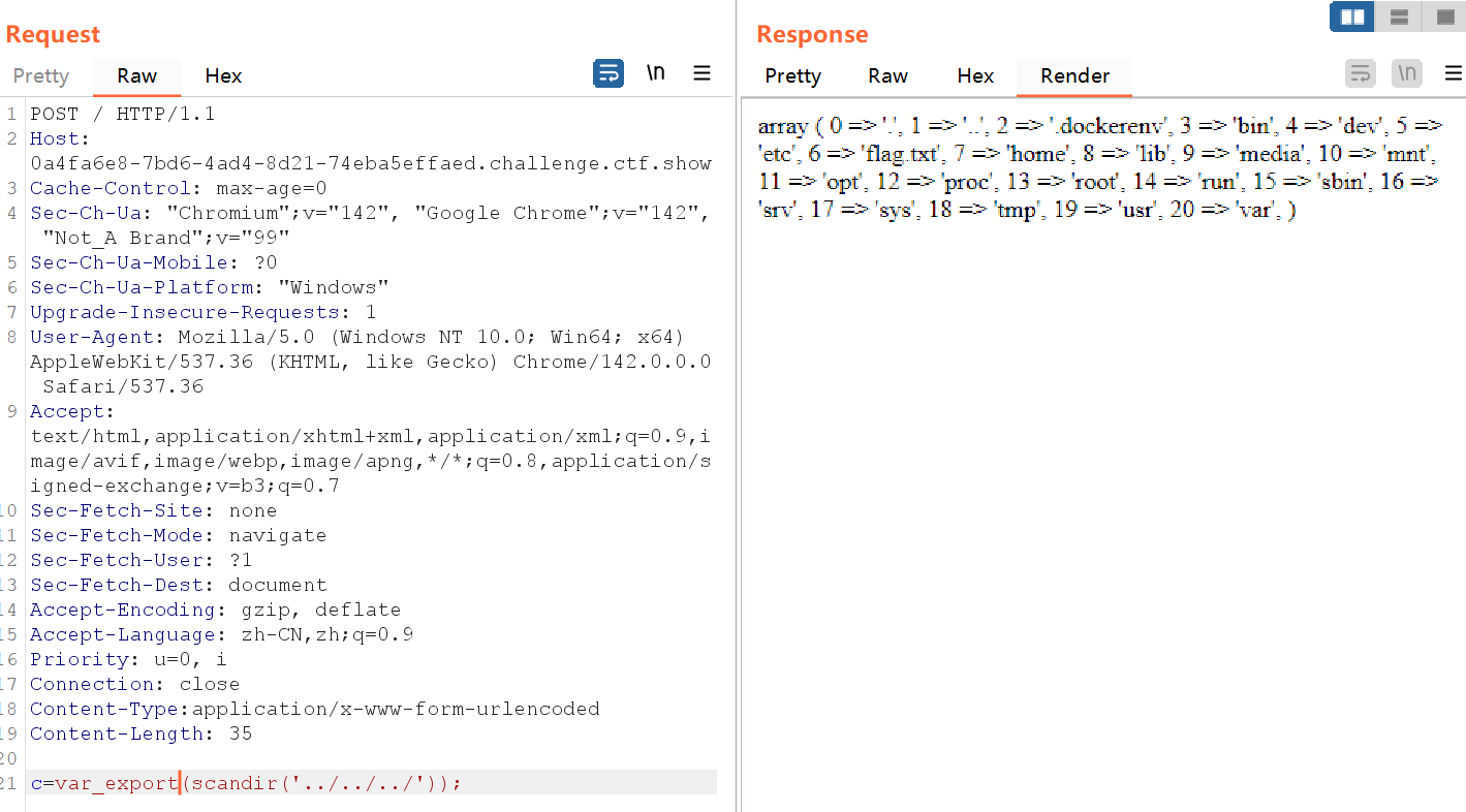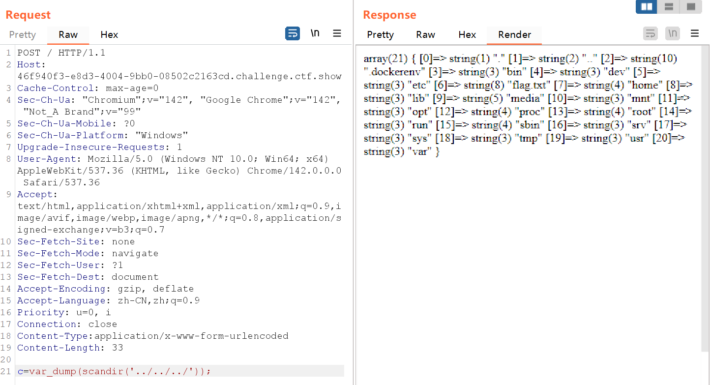 查看flag.txt文件,得到flag。注意scandir返回的是当前文件所在目录的文件,所以使用highlight_file查看时需要再往前一个目录