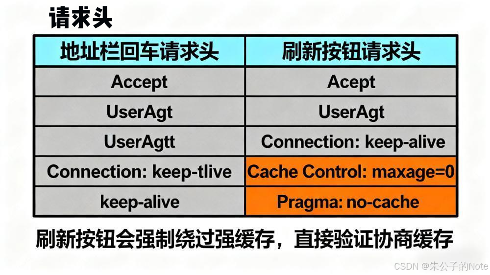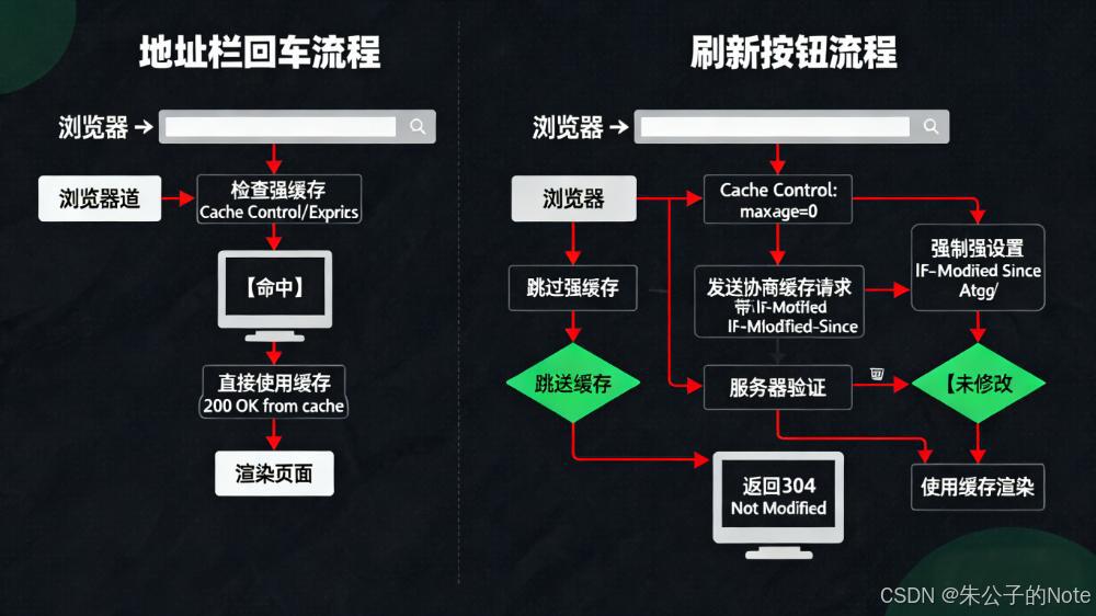 - 关键差异点: 在强缓存有效期内,地址栏回车可能完全不发起网络请求(直接用缓存),而刷新按钮一定会发起验证请求! 这就是为什么有时刷新按钮“看起来没更新”(因为服务器返回了304),但地址栏回车却“更新了”(因为强缓存失效,服务器返回了200)的深层原因。