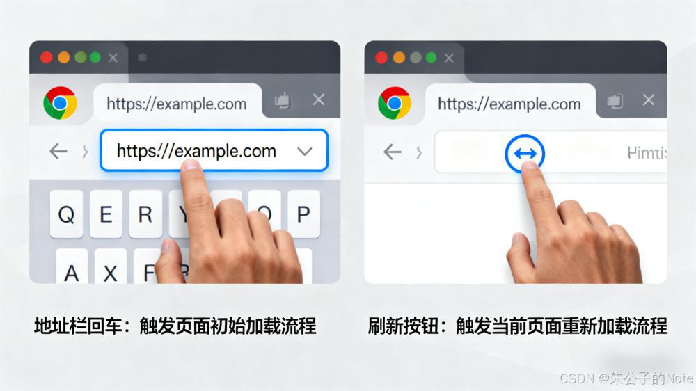 核心观点: 地址栏回车(导航)与点击刷新按钮(重载)在浏览器内核中被视为不同类型的事件,导致它们在缓存验证策略、页面生命周期处理、Service Worker 介入程度以及资源加载优先级上存在显著差异。地址栏回车更偏向“新导航”,刷新按钮则更偏向“强制重载”。