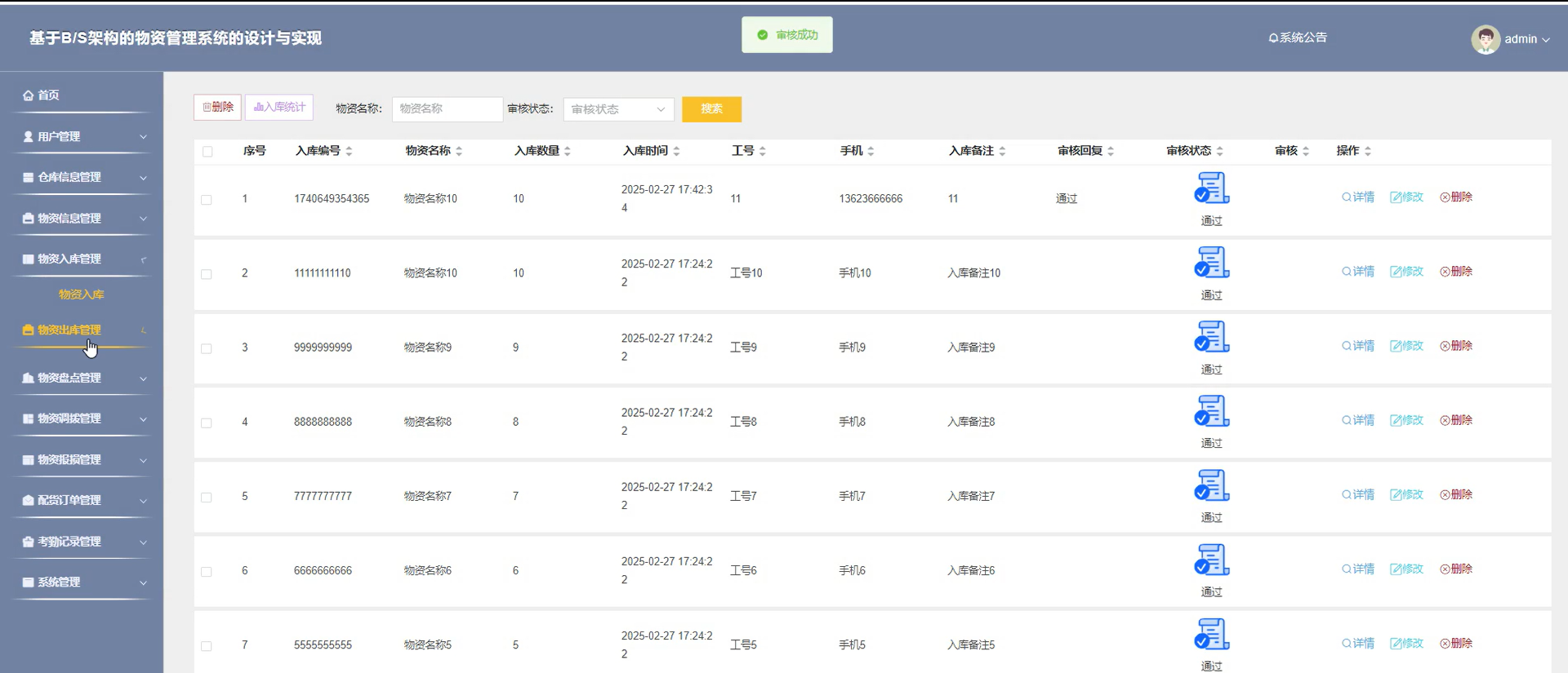 - 数据库设计:包含管理员表、物资信息表、仓库信息表、入库表、出库表、盘点表、配货订单表 7 大核心表,通过 “主键关联” 实现数据关联(如入库表通过 “工号” 关联员工信息)。