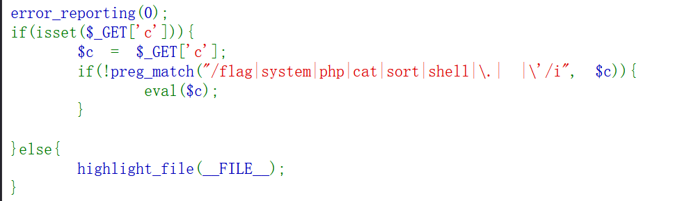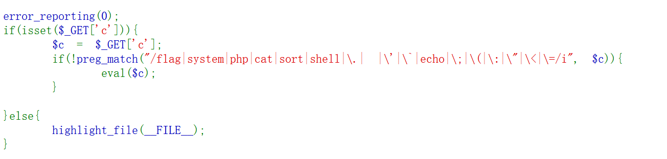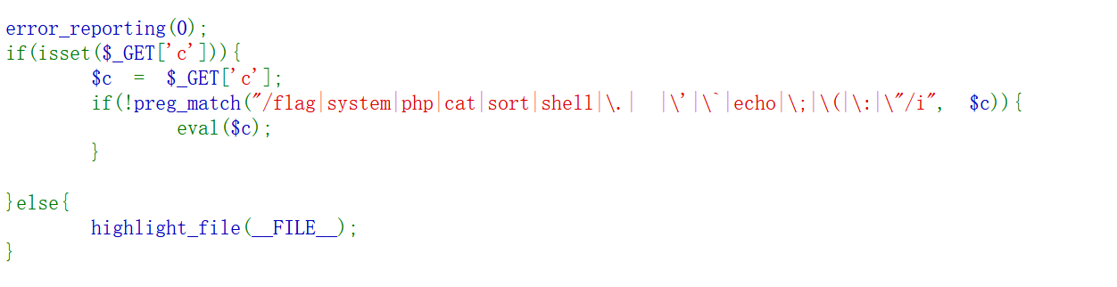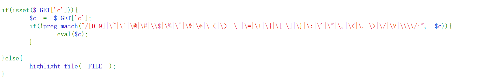 - 在这里可以利用eval这个函数,传入c参数值,进行命令执行,比如system('ls')查看文件列表
