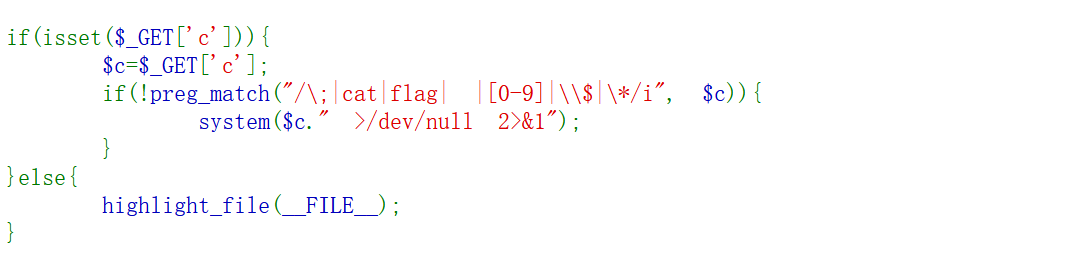 - 这里过滤了system函数执行,可以使用反引号``来进行绕过。原理:linux的反引号,可以执行命令。可以在一个命令中使用反引号来执行另一个命令,并将结果插入到原始命令中。比如echo `cat flag.php`,那么它执行反引号里面的内容,然后再执行echo。这样就可以绕过题目中的过滤。